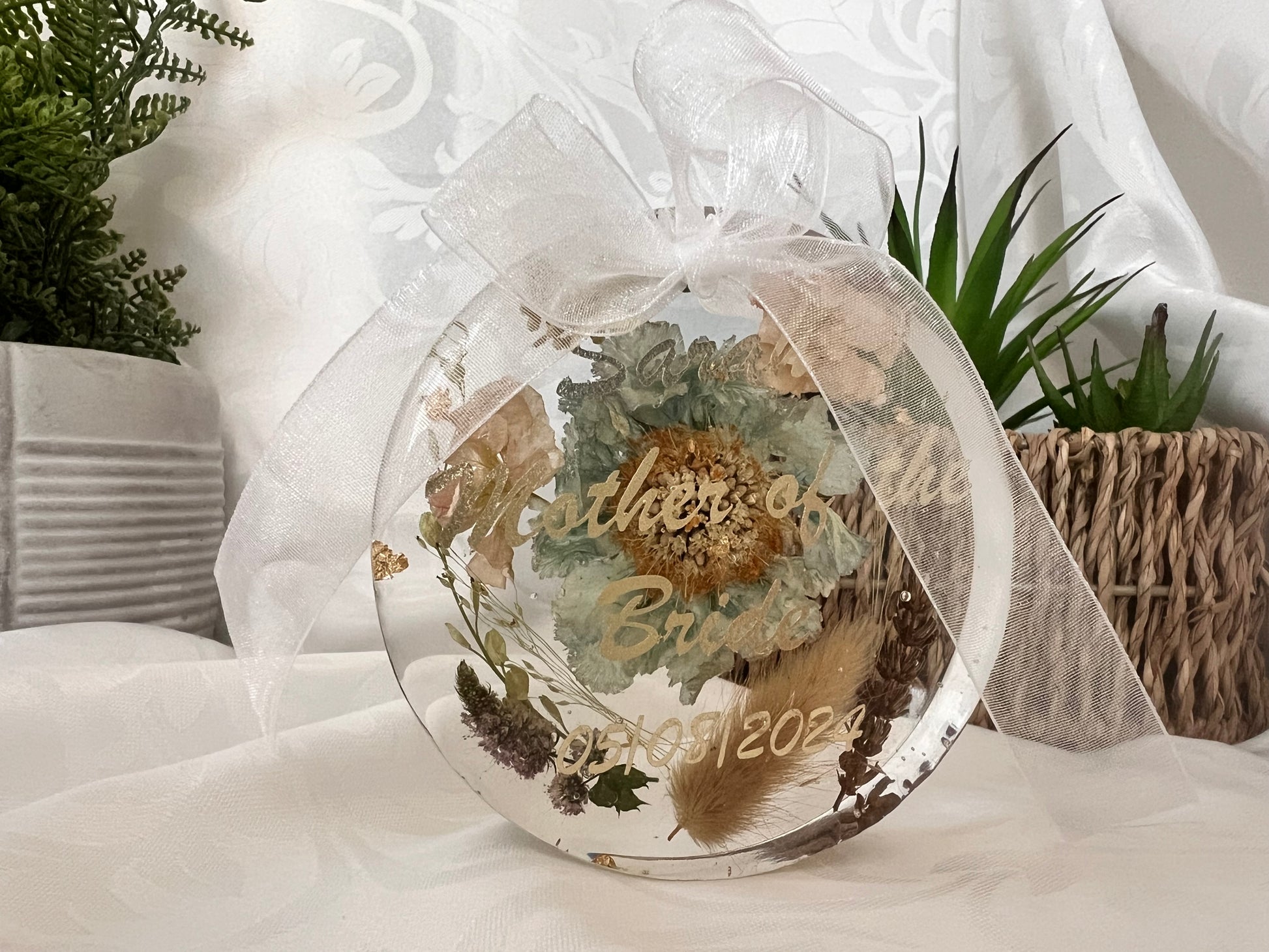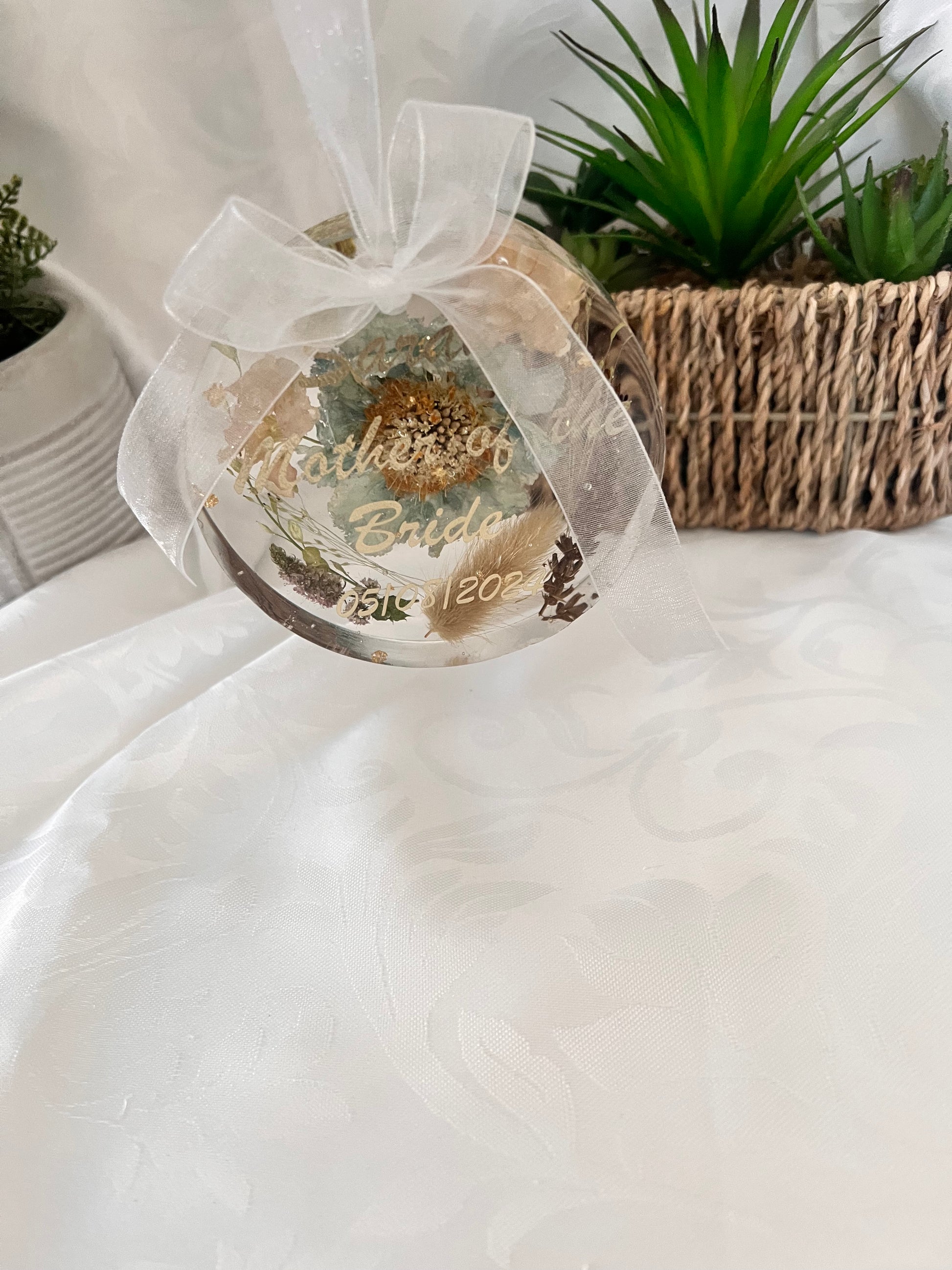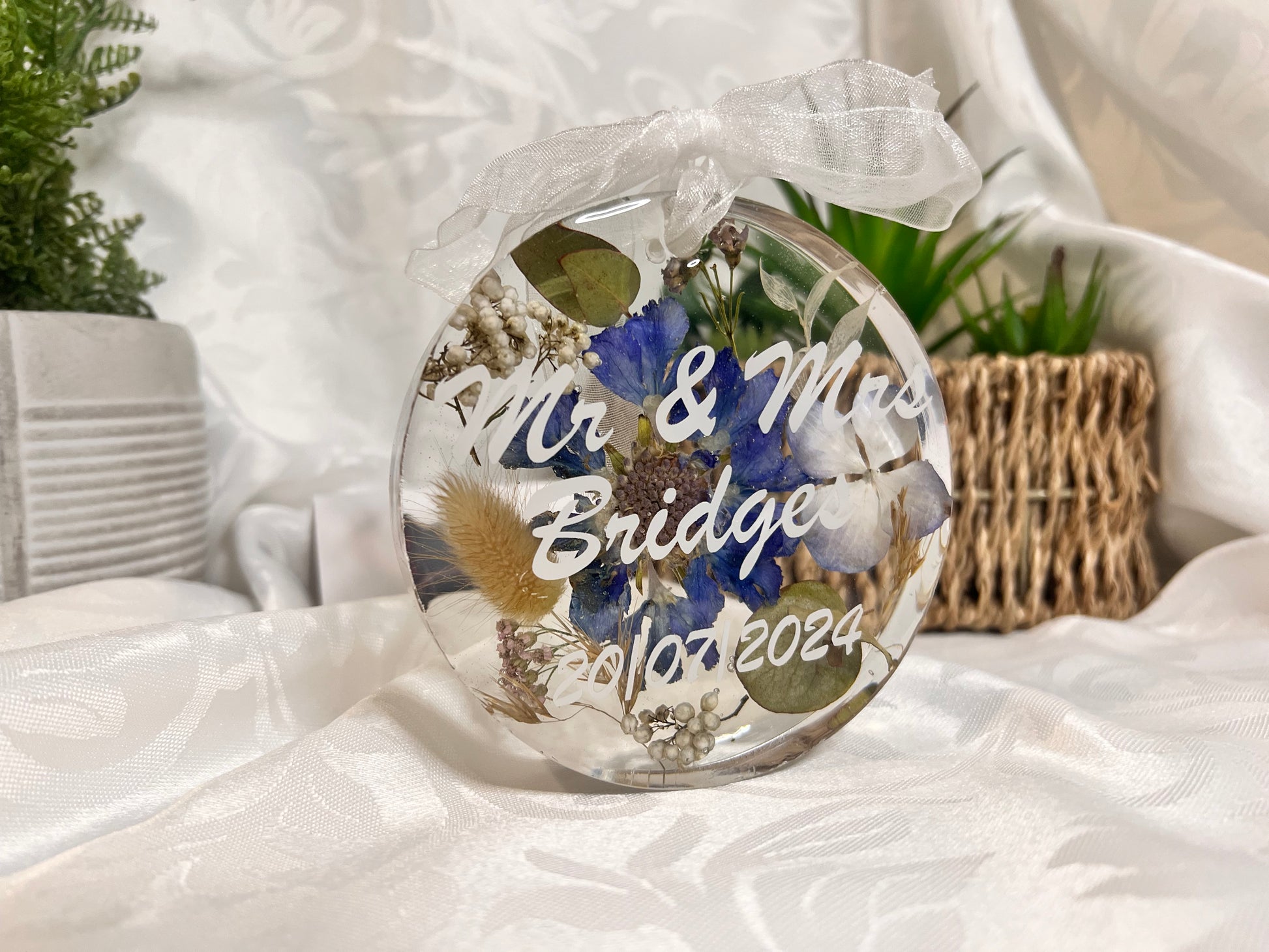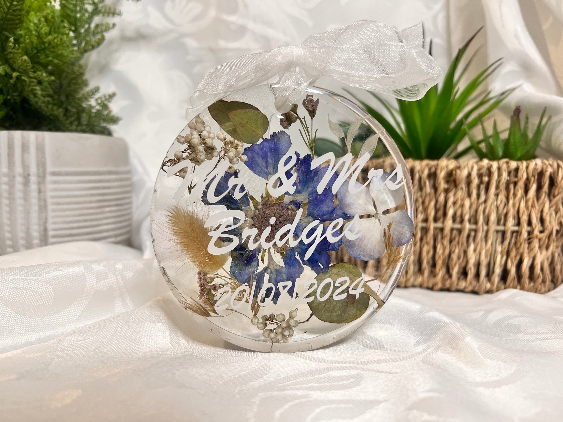 These hanging ornaments come with white organza ribbon tied in a bow, with a loop hole to hang your precious ornament. They make great gifts for any occasion particularly where you may want to preserve some flowers as a keepsake from a wedding, christening, anniversary, special birthday or sadly from memorial bouquets too. These are all individually designed and crafted in resin making them unique. Occasionally there may be small bubbles, small holes and slight bumps/indents in the resin given that it is handmade and actually adds to the charm of the piece. Please feel free to message for any specific details or to just discuss your requirements and design before placing your order. We pride ourselves on excellent customer service.