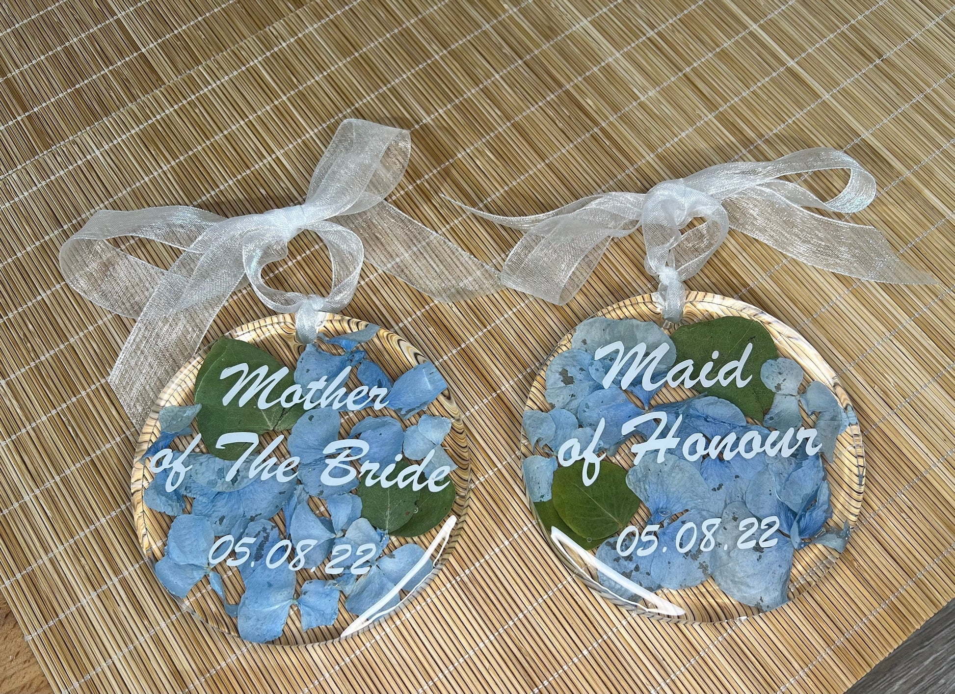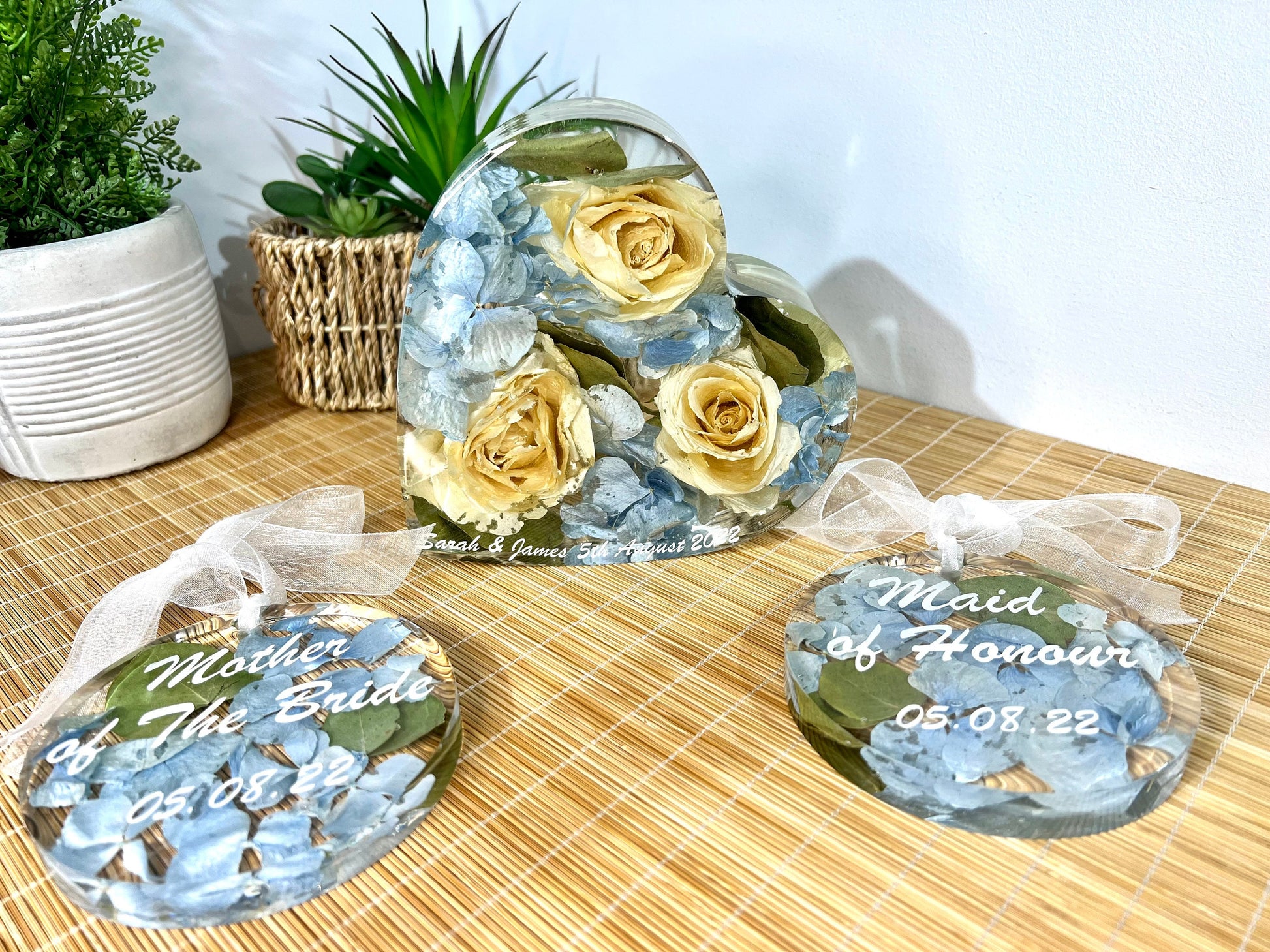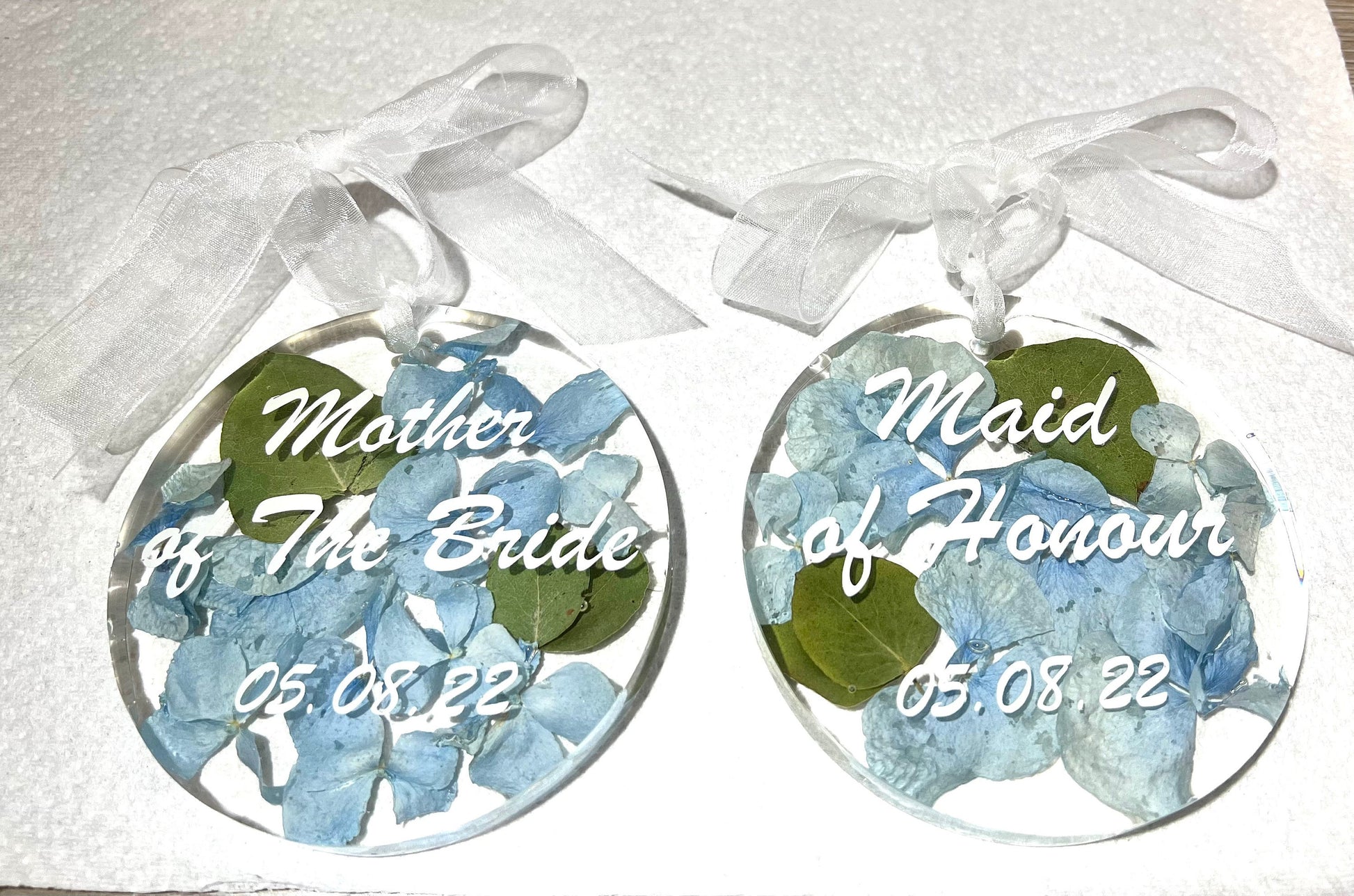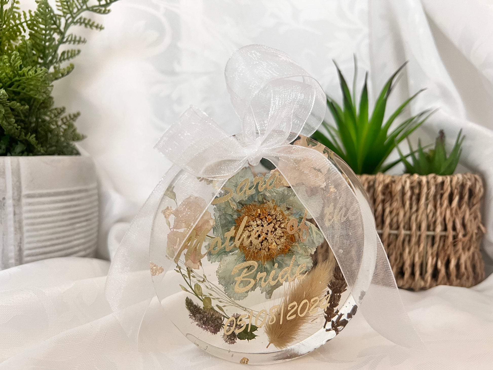 These hanging ornaments come with white organza ribbon tied in a bow, with a loop hole to hang your precious ornament. They make great gifts for any occasion particularly where you may want to preserve some flowers as a keepsake from a wedding, christening, anniversary, special birthday or sadly from memorial bouquets too. These are all individually designed and crafted in resin making them unique. Occasionally there may be small bubbles, small holes and slight bumps/indents in the resin given that it is handmade and actually adds to the charm of the piece. Please feel free to message for any specific details or to just discuss your requirements and design before placing your order. We pride ourselves on excellent customer service.